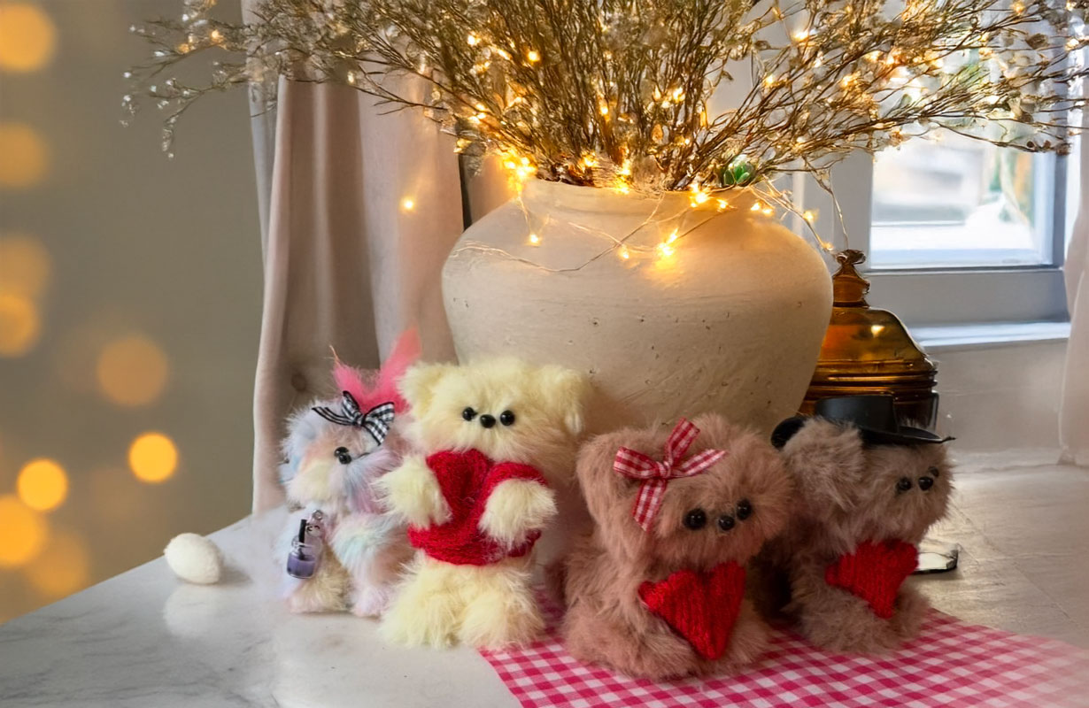 These are not stuffed plushies, they are cozy yet flexible. Each Furry Friend is handmade from the ground up, then finished with its own haircut, styling, and accessories so no two ever feel exactly the same. Clip one to your backpack, keep one on your dash, or gift one to someone who needs a little extra joy.
